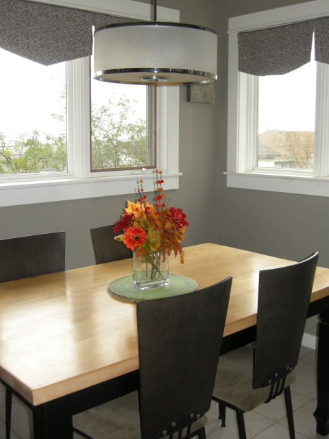 Would you like to see something taller and a little larger here? I feel there is just too much space between the light fixture and the arrangement. The black chairs are very dark and they demand something larger in scale . Better start looking for more deals and find tall, dark elements and another vase.